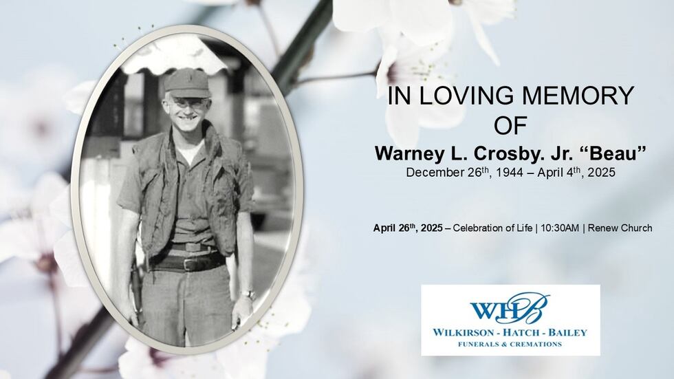 Colonel (Ret.) Warney L. Crosby Jr., lovingly known as “Beau” and “Pa Beau,” passed away peacefully Friday, April 4, 2025, at the age of 80. He was a loyal patriot who proudly served our nation for most of his life.